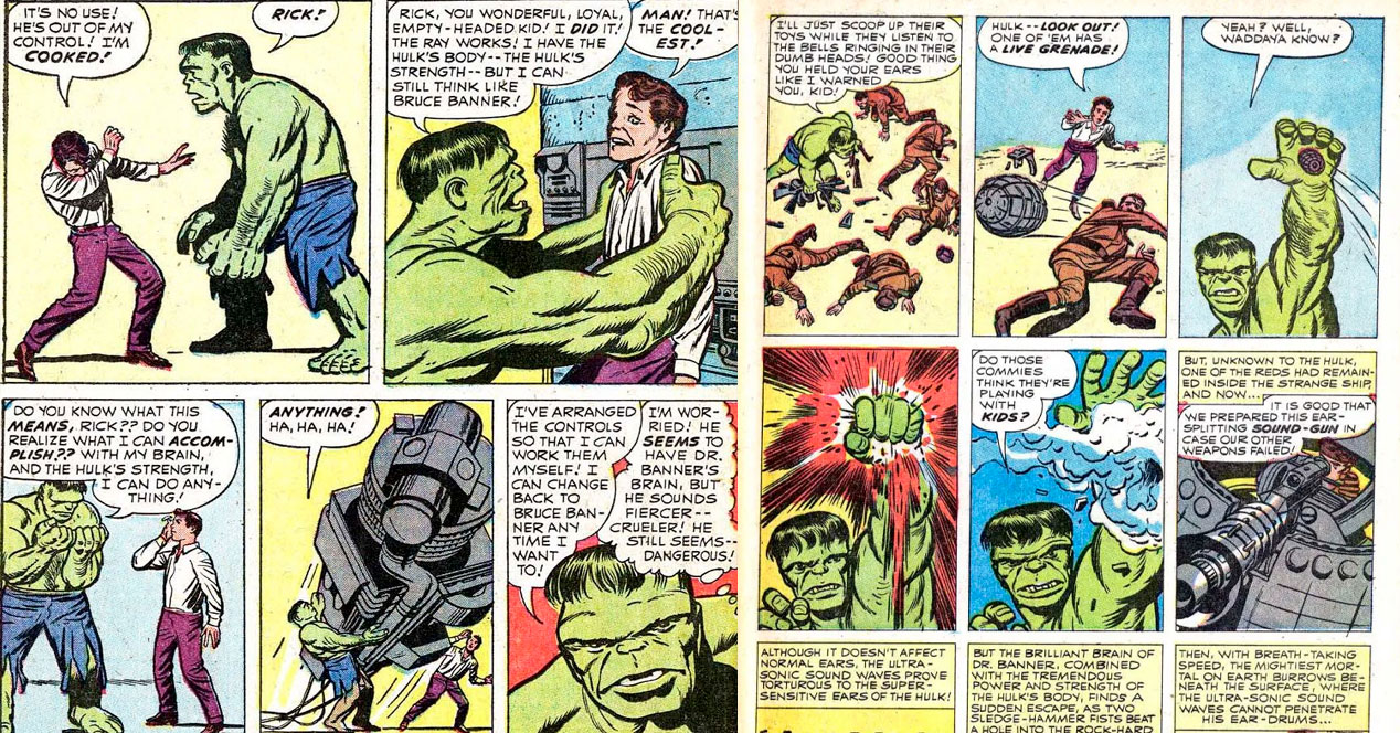 Когда в комиксах появляется Халк, уже намечены общие черты характера. Роберт Брюс Бэннер — ученый, работающий над гамма-радиационной бомбой. для армии Соединенных Штатов. В одном из испытаний что-то идет не так, и Брюс понимает, что на полигон попал молодой человек по имени Рик Джонс. В последней отчаянной попытке спасти его ей удается столкнуть его в защищенную от взрыва зону с такой неудачей, что Бэннер подвергается почти смертельному воздействию этого излучения. С этого момента его ДНК будет изменена, и у него будет две личности.