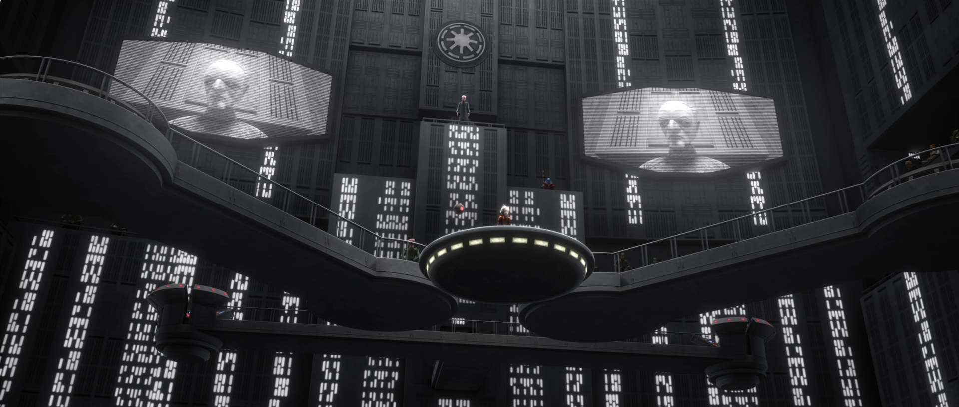 Суд над Асокой Тано проходил в огромном зале заседаний республиканского центра военных операций. Верховный канцлер Шив Палпатин председательствовал на заседании в сопровождении своих стражников. Закованную в кандалы Тано сопроводили к платформе, на которой она была перемещена в центр зала. По обе стороны от них рядами по десять-двенадцать человек сидели сенаторы, исполнявшие обязанности присяжных. Высший Совет джедаев, наблюдая за процессом, сидел в другом ряду над сенаторами.