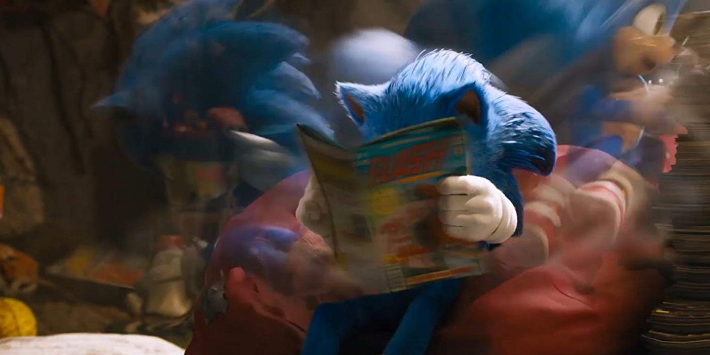 Первая сцена с Соником в его холостяцкой жизни. пещера имеет массу пасхальных яиц. Во-первых, повязка Соника, которую он носит во время тренировки нунчаку, имеет классическую форму. Соник логотип на нем. Во-вторых, стол, на котором Соник играет в пинг-понг против самого себя, является знаком выхода с Hill Top Rd, который ведет к Hill Top Zone из игр. И, наконец, когда Соник сидит на своем кресле-мешке и рассказывает о своей коллекции комиксов, мы видим, как он читает целую кучу Вспышка комиксы. Имеет смысл, что самое быстрое живое существо будет большим поклонником самого быстрого живого человека DC. Где фильм-кроссовер?