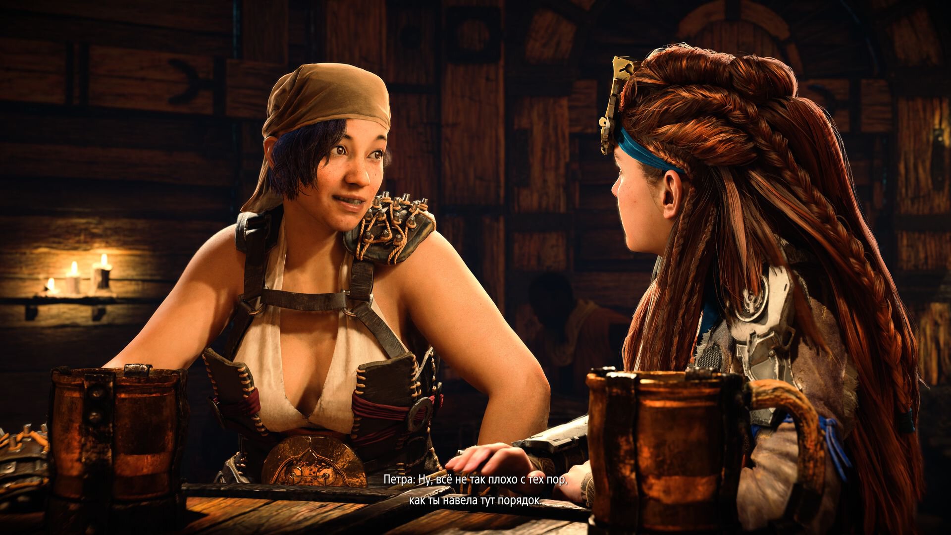 Кроме того, удивляет режиссура… всего. Почти все диалоги в Zero Dawn, даже сюжетные, были мертвыми: Элой и NPC стояли друг напротив друга по стойке смирно, роботически двигали губами, иногда поворачивали головы. В сиквеле же практически невозможно найти подобные кат-сцены. Везде полностью задействована мимика актеров, обыграно окружение, происходит какой-то экшен. Больше всего меня удивила сценка в пабе с давней подругой Элой: там в разговор героинь неожиданно вписался местный завсегдатай, сидевший вне кадра. И это произошло даже не в рамках квеста – я просто увидел знакомую и подошел пообщаться.