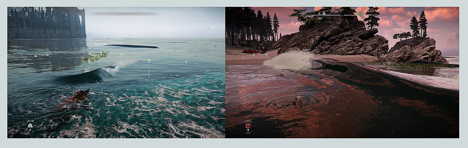 Волны в Horizon: Forbidden West на релизе и после выхода нескольких патчей. Улучшилась физика воды и визуальная часть, в том числе детализация объектов и спецэффектыСкриншоты: Horizon: Forbidden West / Guerrilla Games