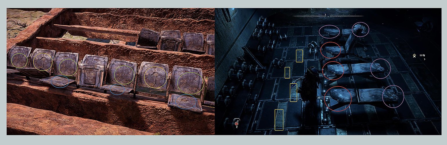 Слева — сиденья на заброшенном стадионе в Horizon: Zero Dawn, справа — тренировочные скамьи в убежище Предтеч в Horizon: Forbidden West. Цветом выделены одинаковые ассетыСкриншоты: Horizon: Zero Dawn, Horizon: Forbidden West / Guerrilla Games