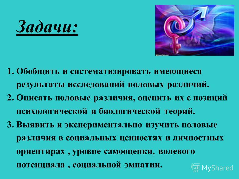 Задачи: 1. Обобщить и систематизировать имеющиеся результаты исследований половых различий. 2. Описать половые различия, оценить их с позиций психологической и биологической теорий. 3. Выявить и экспериментально изучить половые различия в социальных ценностях и личностных ориентирах, уровне самооценки, волевого потенциала, социальной эмпатии.