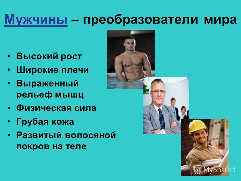 Мужчины – преобразователи мира Высокий рост Широкие плечи Выраженный рельеф мышц Физическая сила Грубая кожа Развитый волосяной покров на теле