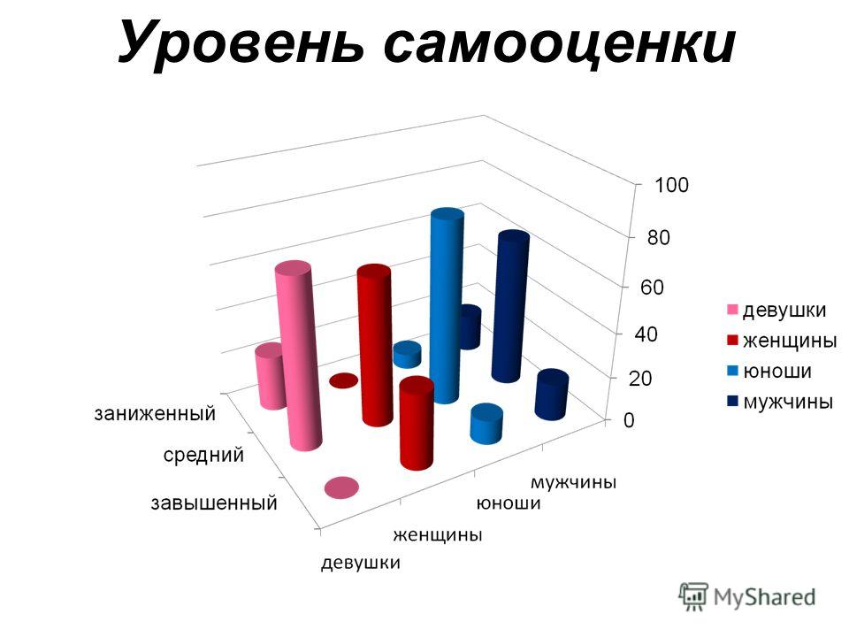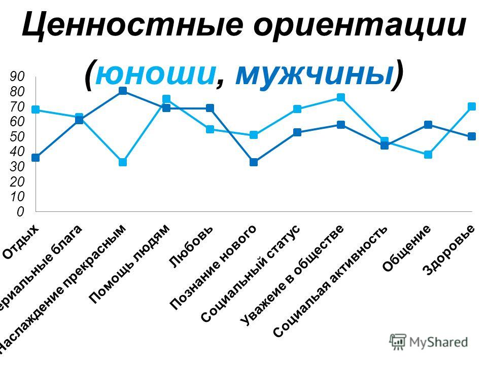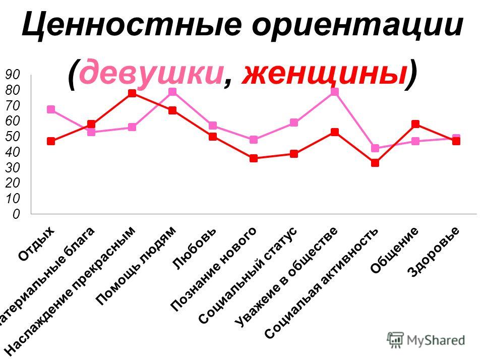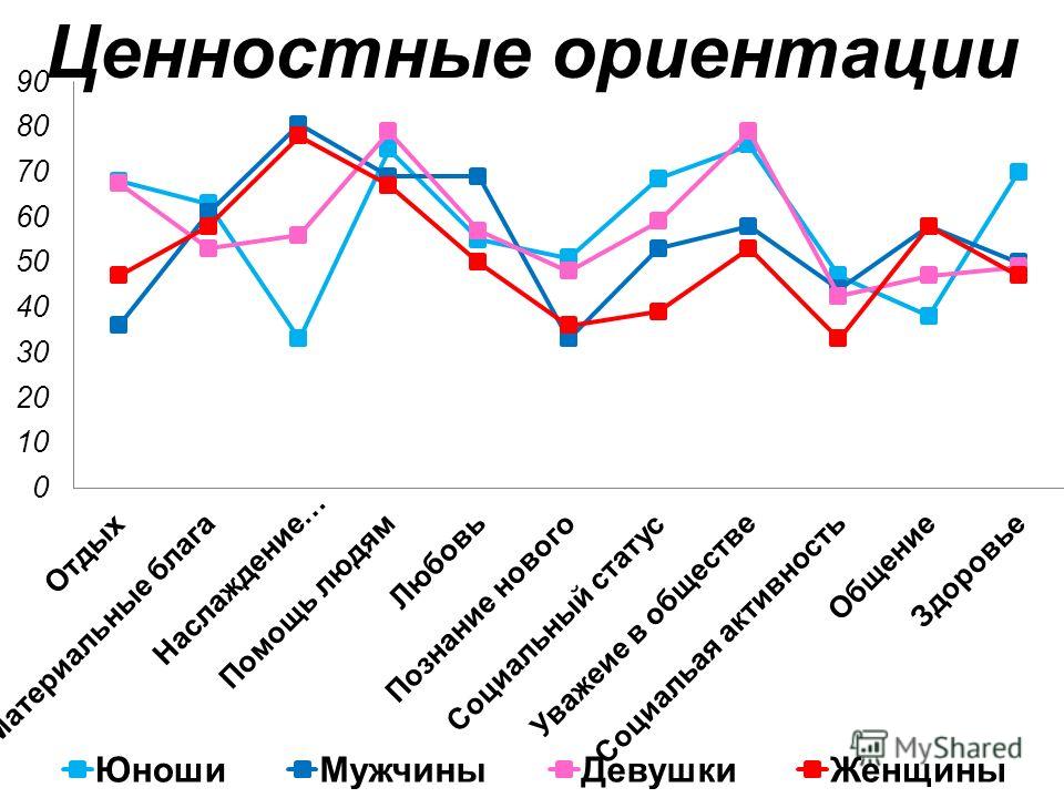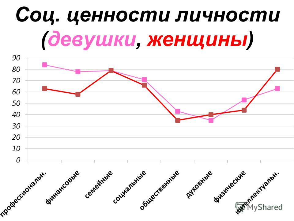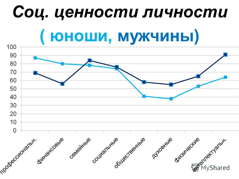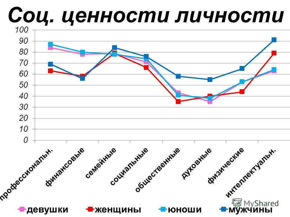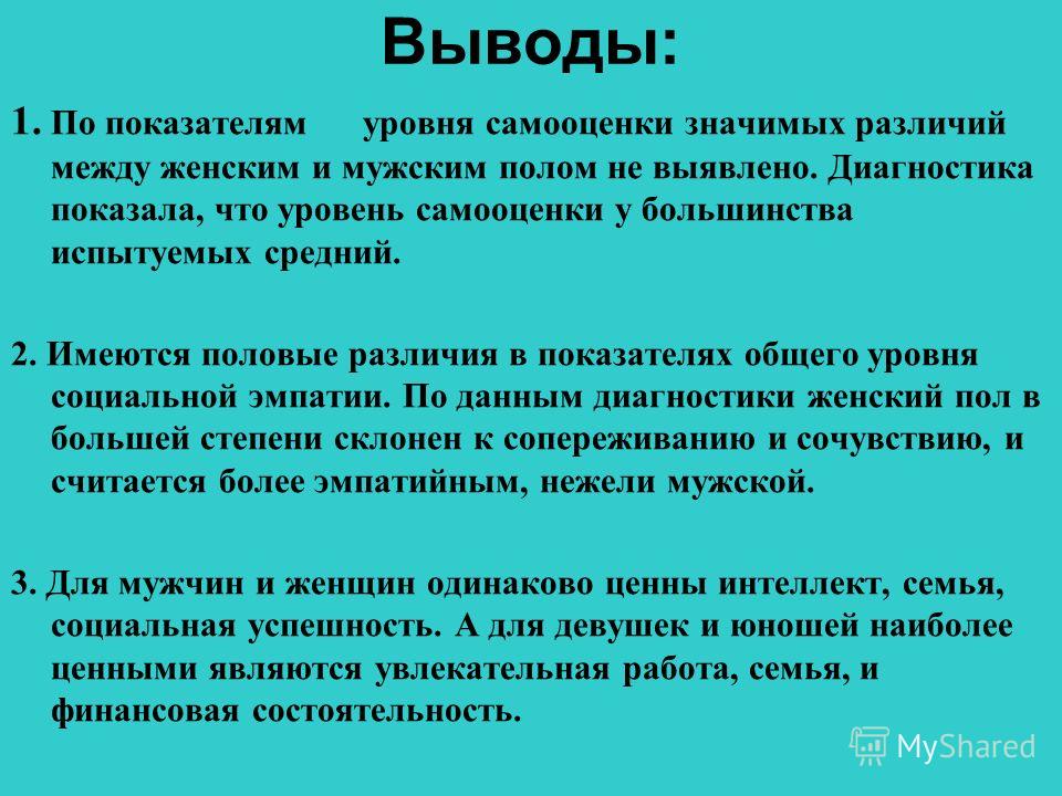 Выводы: 1. По показателям уровня самооценки значимых различий между женским и мужским полом не выявлено. Диагностика показала, что уровень самооценки у большинства испытуемых средний. 2. Имеются половые различия в показателях общего уровня социальной эмпатии. По данным диагностики женский пол в большей степени склонен к сопереживанию и сочувствию, и считается более эмпатийным, нежели мужской. 3. Для мужчин и женщин одинаково ценны интеллект, семья, социальная успешность. А для девушек и юношей наиболее ценными являются увлекательная работа, семья, и финансовая состоятельность.