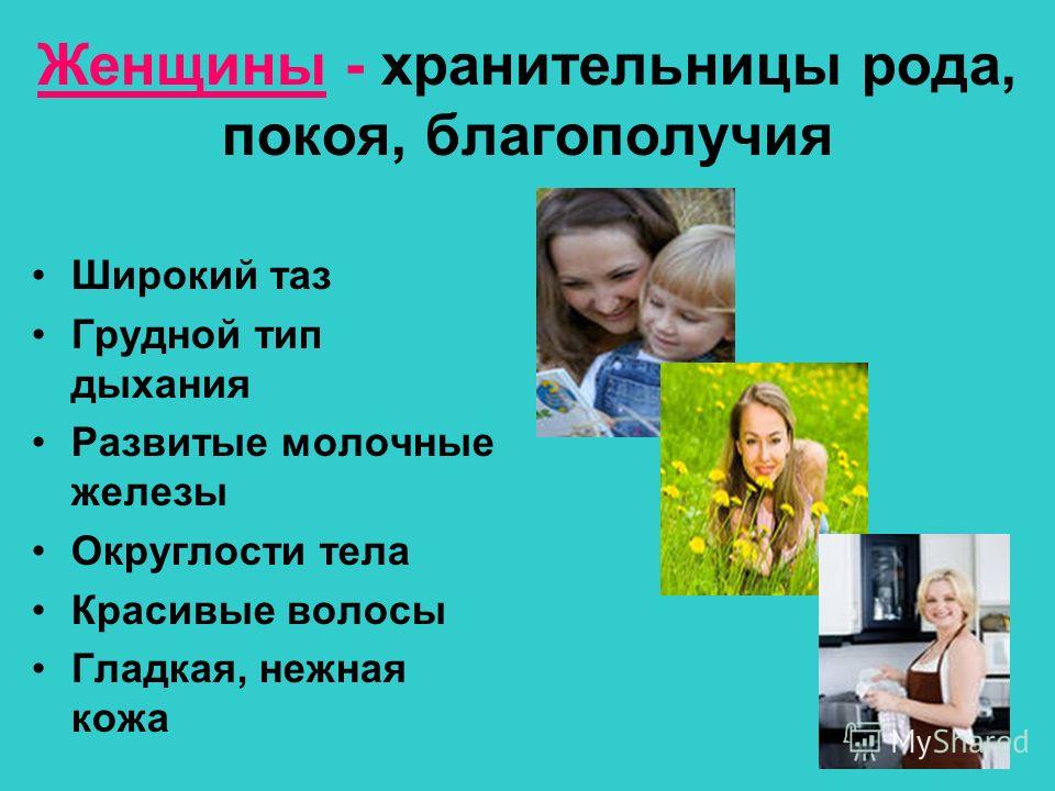 Женщины — хранительницы рода, покоя, благополучия Широкий таз Грудной тип дыхания Развитые молочные железы Округлости тела Красивые волосы Гладкая, нежная кожа
