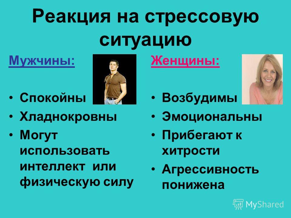 Реакция на стрессовую ситуацию Мужчины: Спокойны Хладнокровны Могут использовать интеллект или физическую силу Женщины: Возбудимы Эмоциональны Прибегают к хитрости Агрессивность понижена