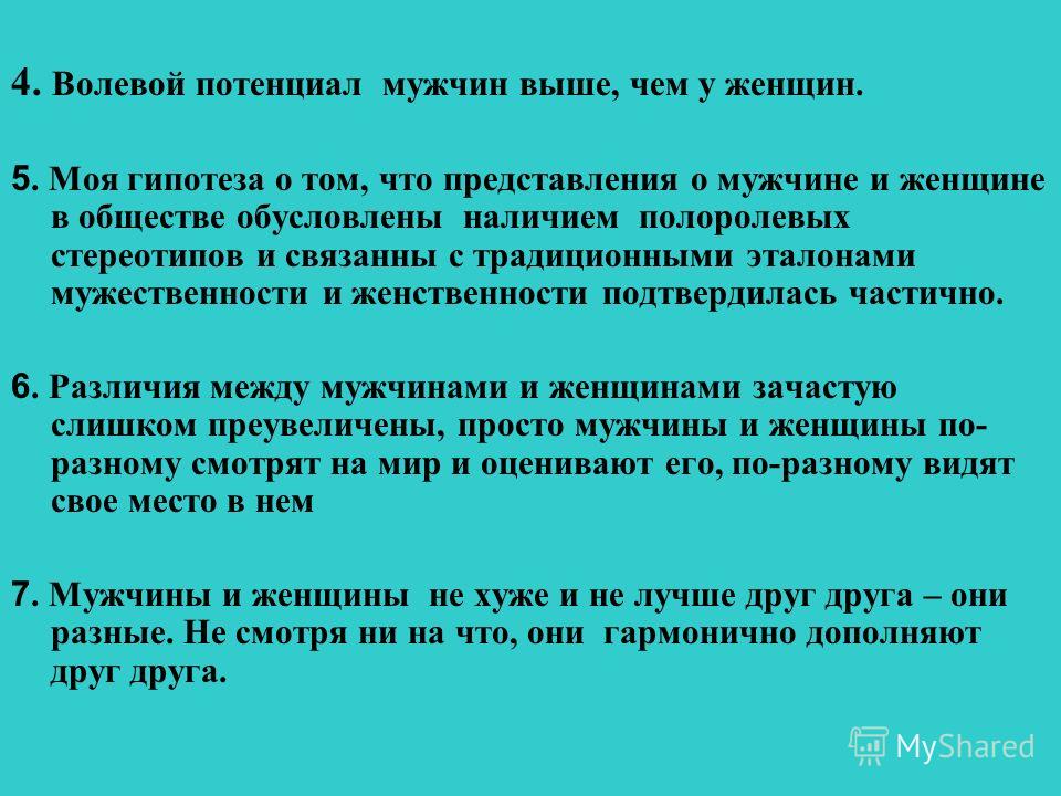 4. Волевой потенциал мужчин выше, чем у женщин. 5. Моя гипотеза о том, что представления о мужчине и женщине в обществе обусловлены наличием полоролевых стереотипов и связанны с традиционными эталонами мужественности и женственности подтвердилась частично. 6. Различия между мужчинами и женщинами зачастую слишком преувеличены, просто мужчины и женщины по- разному смотрят на мир и оценивают его, по-разному видят свое место в нем 7. Мужчины и женщины не хуже и не лучше друг друга – они разные. Не смотря ни на что, они гармонично дополняют друг друга.