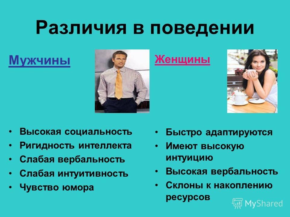 Различия в поведении Мужчины Высокая социальность Ригидность интеллекта Слабая вербальность Слабая интуитивность Чувство юмора Женщины Быстро адаптируются Имеют высокую интуицию Высокая вербальность Склоны к накоплению ресурсов
