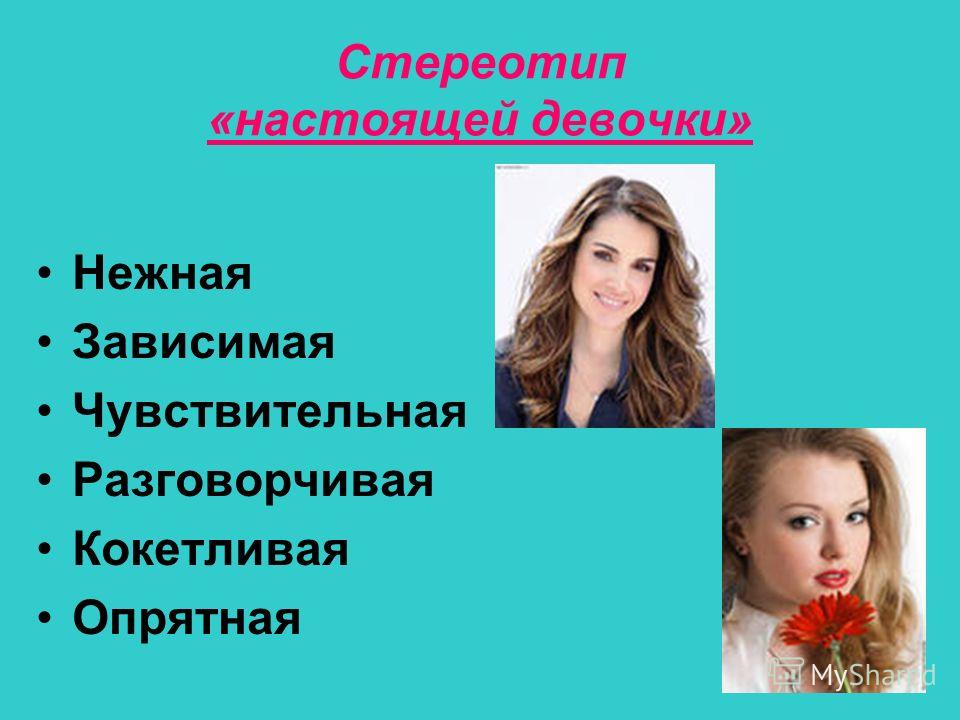 Стереотип «настоящей девочки» Нежная Зависимая Чувствительная Разговорчивая Кокетливая Опрятная