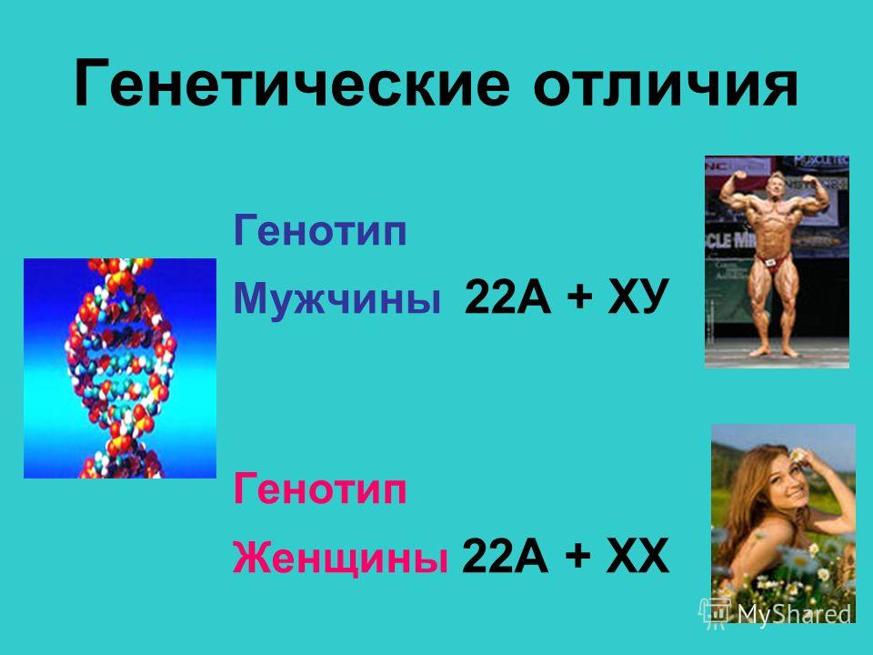 Генетические отличия Генотип Мужчины 22А + ХУ Генотип Женщины 22А + ХХ