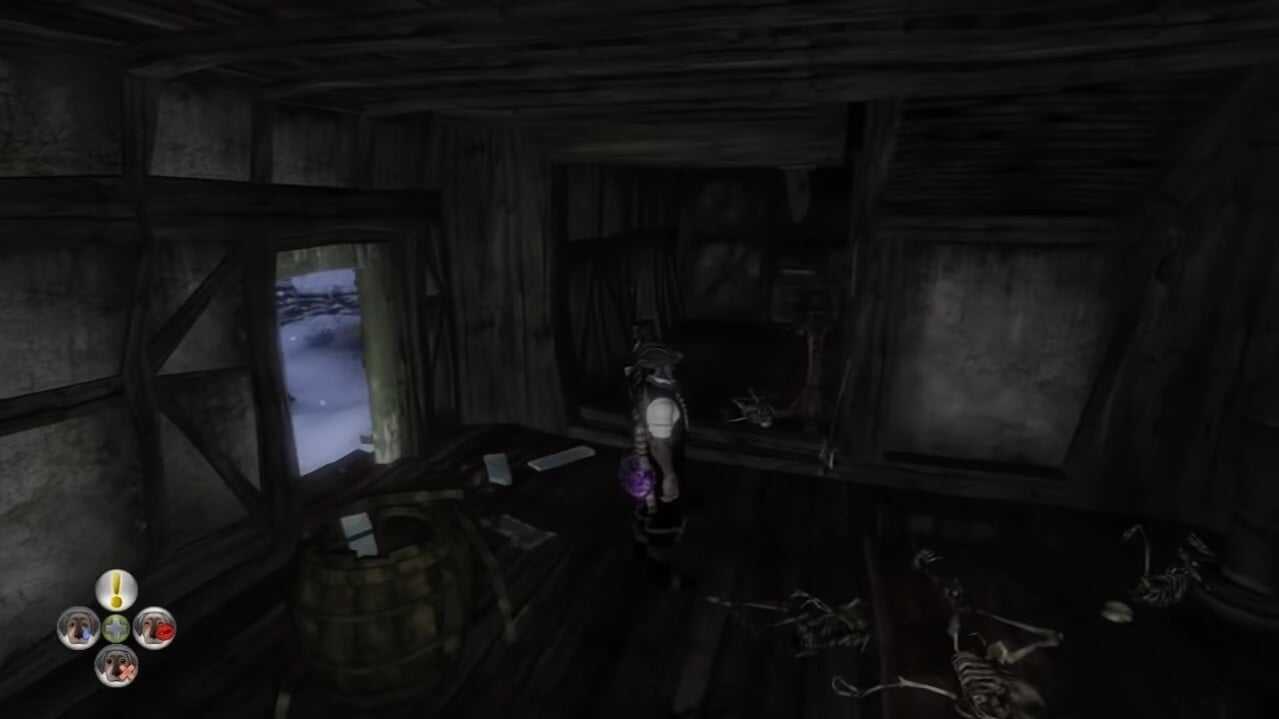 Музыкальная дверь (ей нужно сыграть мелодию) телепортирует игрока на снежную тропу: пробежав вперед, вы видите уютный рождественский домик с горящим светом в окнах. Вот только стоит переступить через его порог, как локация мгновенно превращается в чудовищную сцену массового убийства: кругом разбросаны скелеты и орудия пыток, на полу видны кровавые следы борьбы.
