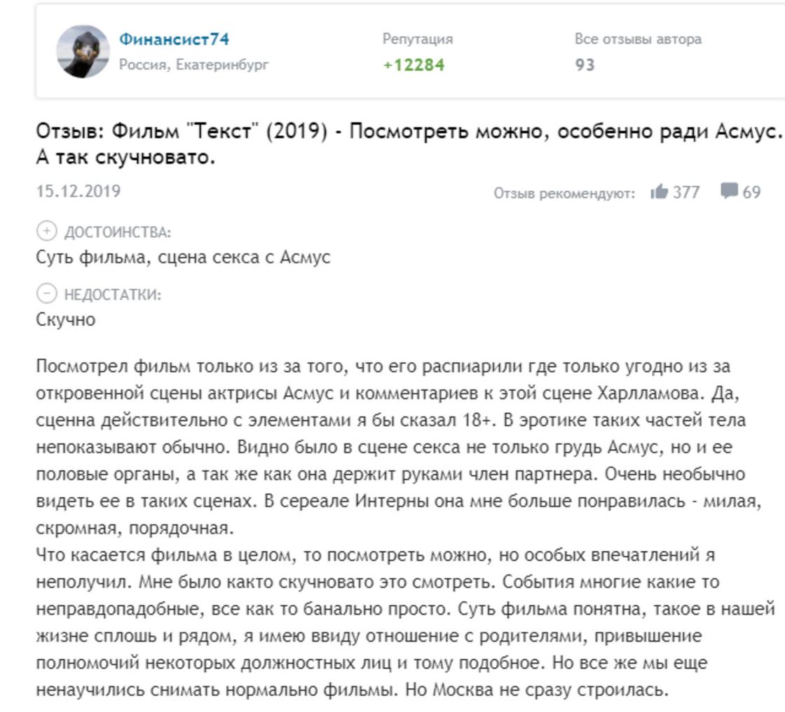 Стал ли прорывом в карьере для Асмус фильм «Текст»? Трейлер без цензуры быстро стал вирусным и породил немало нареканий и злобных комментариев со стороны поклонников актрисы и ее мужа, Гарика Харламова. Стали поговаривать о том, что пара рассталась. Некоторые зрители стали требовать, чтобы актрису лишили родительских прав.