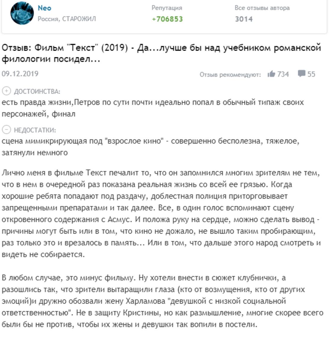 Нестандартный формат криминальной драмы с психологическим уклоном по-разному воспринят зрителями и критиками. Помогут определиться, стоит ли смотреть фильм «Текст», отзывы, которыми поделились киноманы, а также рецензия.