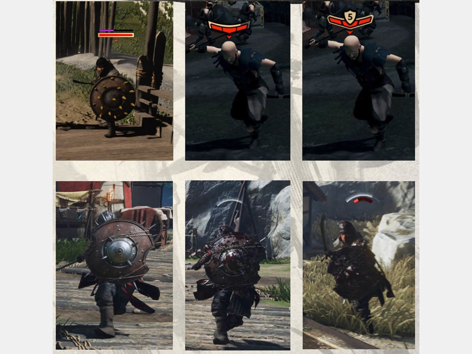 Студия долго экспериментировала с UI в попытках сохранить иммерсивность. Когда дизайнеры отказались от брони, над противниками оставили лишь иконку ошеломления, а также индикацию о низком здоровье. При этом изначально иконки отсутствуют и появляются непосредственно после ошеломления (см. три нижних кадра)Кадр: Sucker Punch / GDC / YouTube