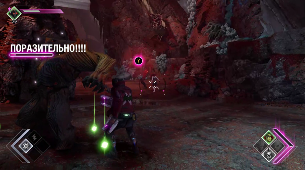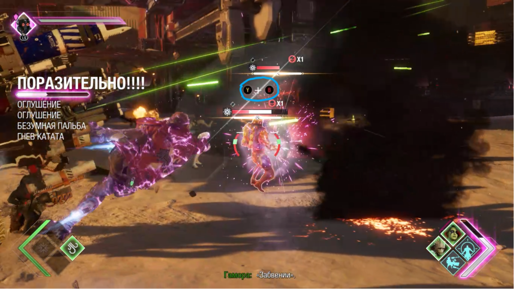 Боевая система в далеко не лучшая часть игры, но в ней есть одна уникальная особенность, которой хотелось бы посвятить отдельный пункт нашего гайда по Marvel’s Guardians of the Galaxy. Речь идет о так называемой «летучке» – ультимативной способности, накопляющаяся по мере сражения в специальной шкале. После ее активации можно усилить всю команду или получить снижение урона Квилла – здесь все зависит от ваших ответов после активации «летучки».