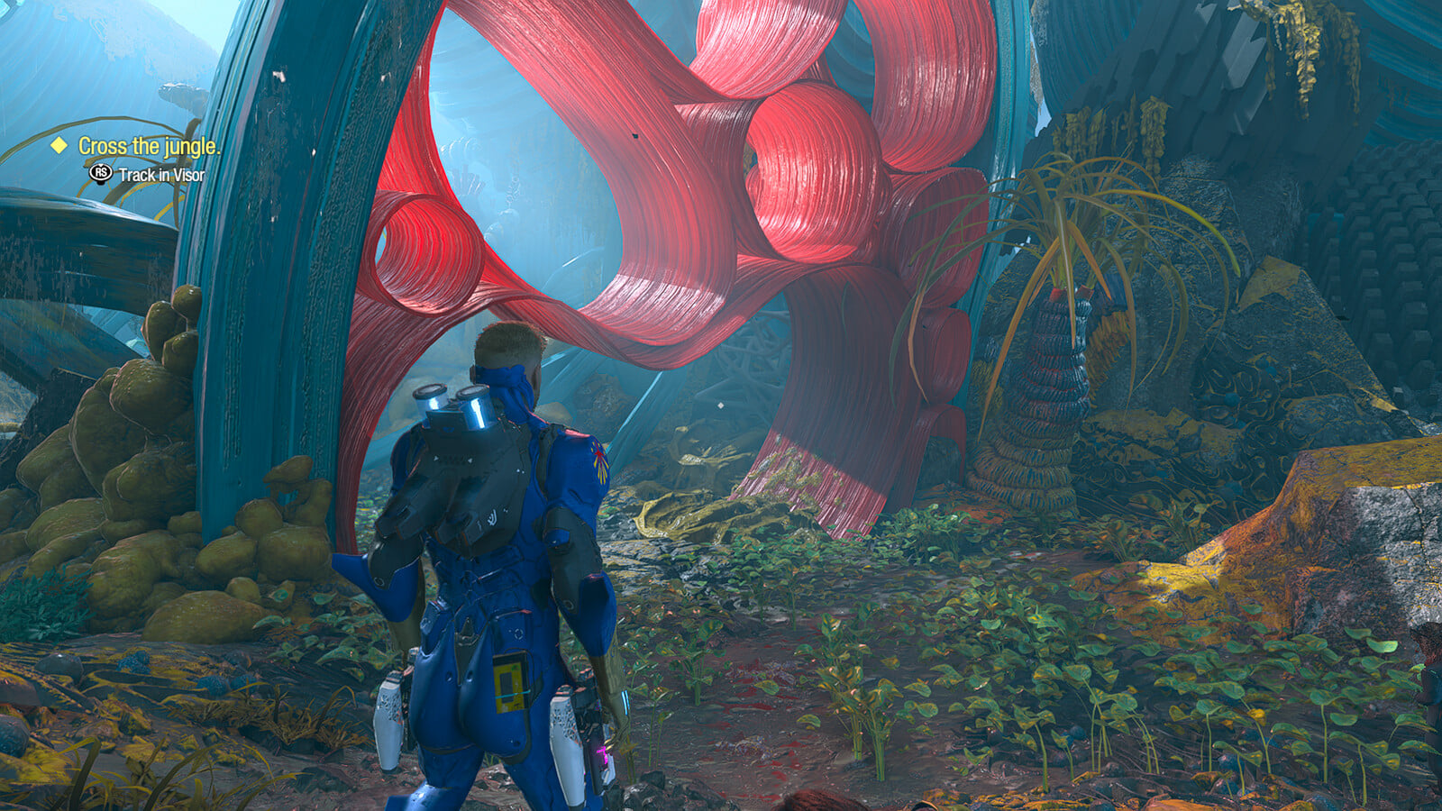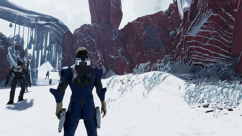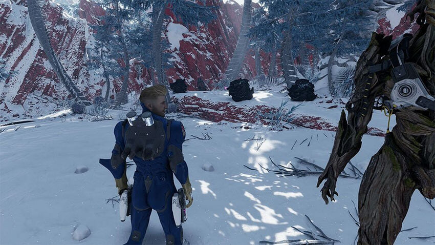 После того как вы заметите Вендиго и преодолеете лес с ядовитыми растениями, пройдите мимо двух красных деревьев и держитесь правее, пока не окажетесь в зоне с другими ядовитыми растениями. Выжгите их плазменными залпами и возьмите костюм в центре.
