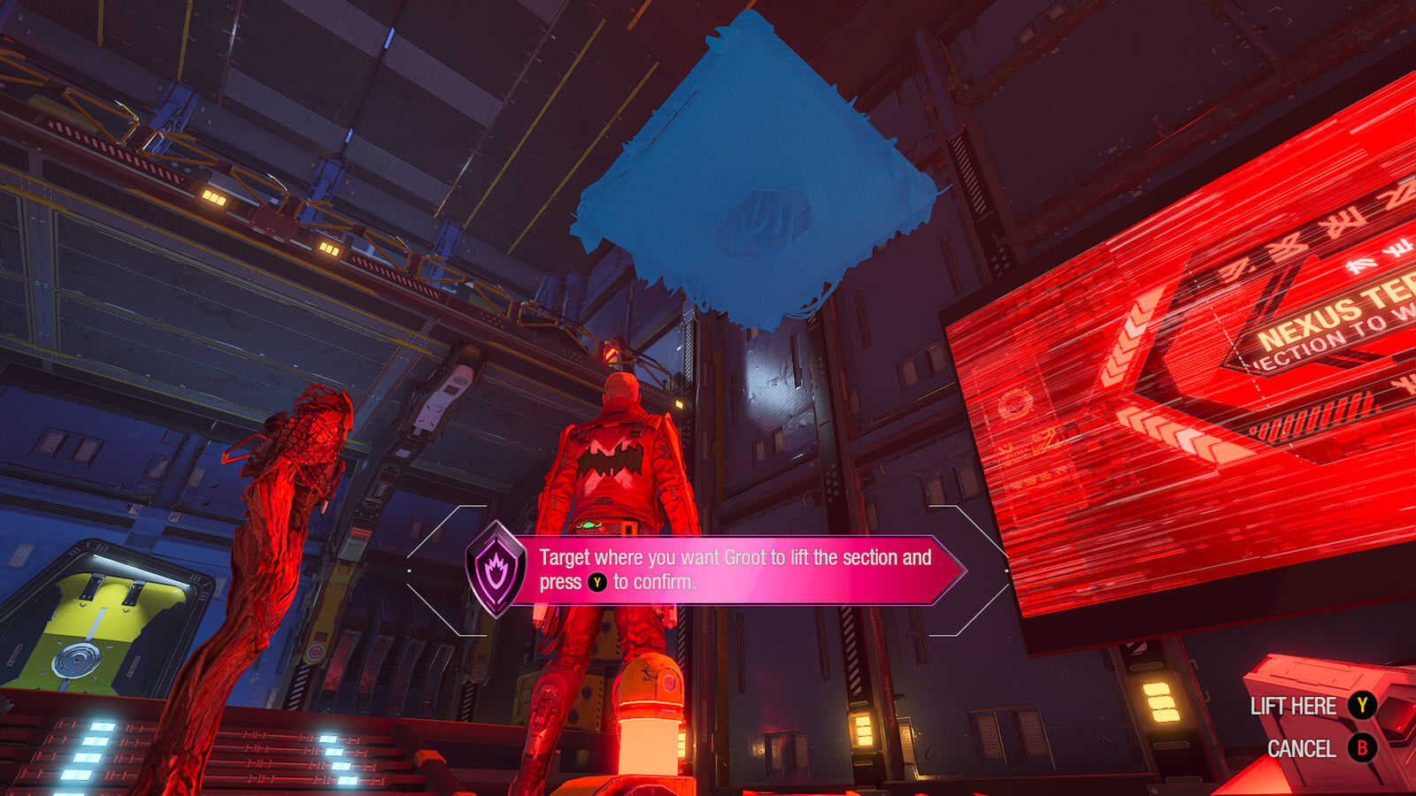Each of your team members can be prompted to help you traverse or unlock things (or smash them) in the environment using the same left bumper system. Rocket can unlock doors or fit through small spaces, Gamora can slice through things or help you climb up walls. Drax hits things very, very hard, and Groot can grow out bridges or raise platforms. It works well and I liked how depending on the team’s mood they would sometimes just do these things on their own without my prompting in a realistic manner.