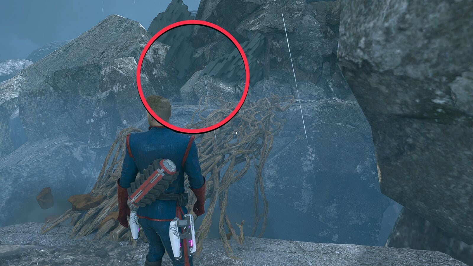 После уничтожения двух хвостатых монстров вы найдете электрическую клетку. После этого попросите Грута сделать мост, чтобы пройти вперед. Затем двигайтесь по левому пути: вам понадобиться расстрелять серую массу, чтобы зайти в пещеру. Внутри используйте элементальные модификаторы, чтобы заморозить воду и сделать платформу для себя. Поднимайтесь наверх, выбирайтесь из пещеры – вы увидите костюм у обрыва.