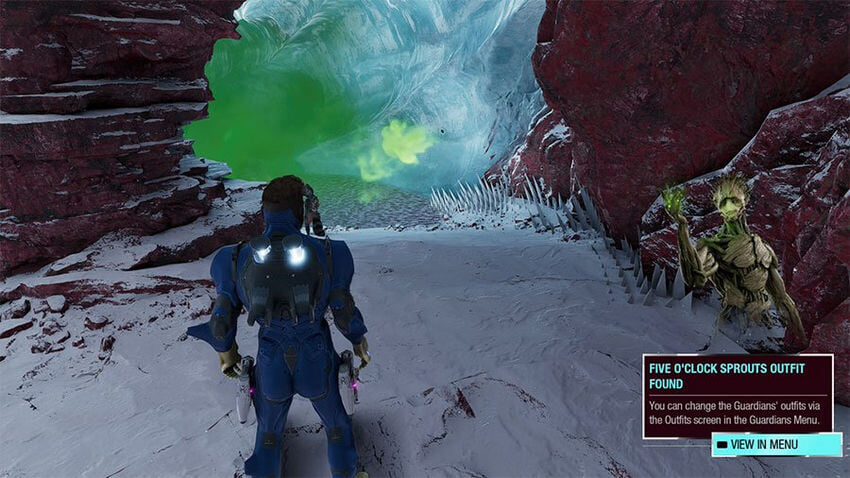 После сценки с Космо вас ждет сражение в снежной зоне. После него используйте способность Дракса, чтобы переставить объект и добраться до следующего уровня платформ. Затем идите направо и попросите Гамору забраться на стену, чтобы запрыгнуть на самый верх и взять костюм.
