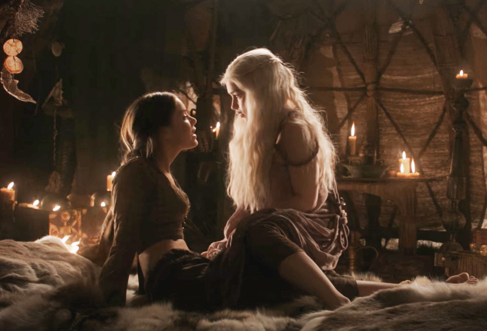 - 1 сезон, 2 серия: обучение ее служанкой и бывшей куртизанкой Дорой искусству любви, а также сцена с ее новым мужем Кхалом Дрого (Джейсон Момоа).