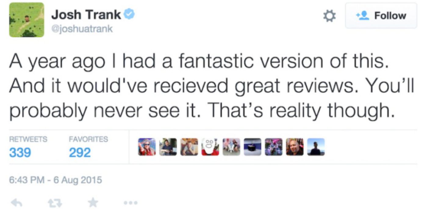 Пока что у нас есть ситуация, за которой никто не был: Фантастическая четверка перезагрузить, что, кажется, никто не особенно доволен. Студия показала это поздно, что редко является признаком доверия. Чирикать Транка предполагает, что окончательный вариант не был близок к его. И, возможно, хуже всего то, что мы, просто промоутеры, выбравшиеся посмотреть фильм, были подведены.