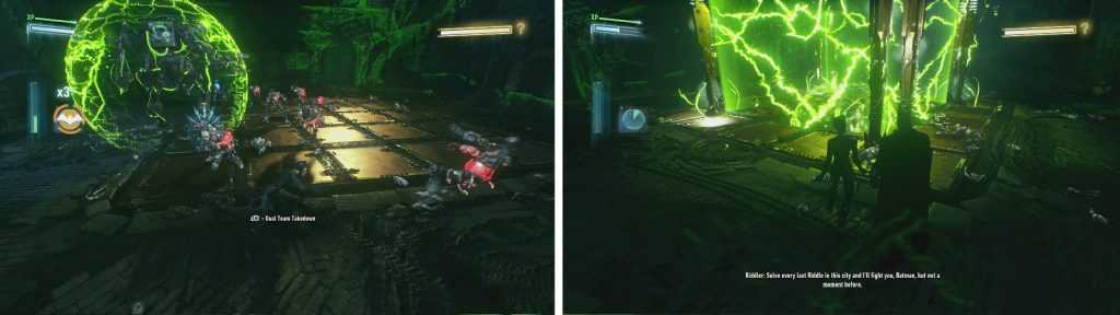 Вам нужно будет победить всех роботов Загадочника, чтобы продолжить (слева). Если вы еще не нашли все трофеи Загадочника, Загадочник сбежит (справа).