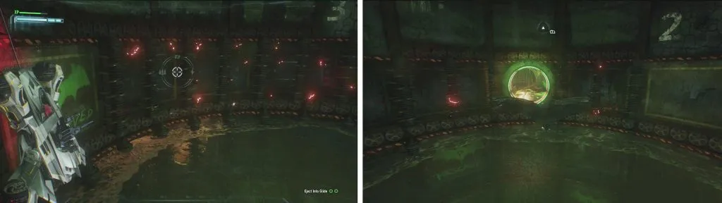 В этой области поверните за угол и активируйте нажимную пластину, чтобы в последний раз понизить уровень воды. Перед выходом переключитесь на дистанционное управление бэтмобилем и используйте его, чтобы стрелять в сторожевые башни, которые появились в коридоре позади вас.