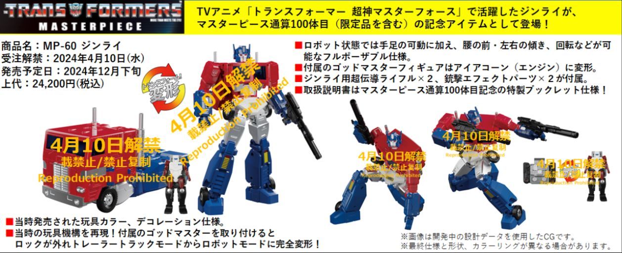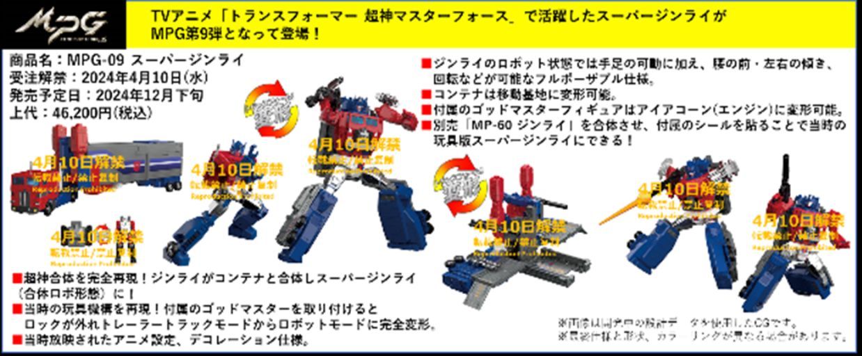 В западном мире во время первого запуска игрушка называлась «Powermaster Optimus Prime», но в то время она не поставлялась в комплекте с Godbomber. Позже на рынки вышла переработанная версия, в упаковке которой был Godbomber (переименованный в Apex Bomber). Более подробная информация о предстоящих игрушках «Шедевр», включая варианты предварительного заказа и даты их запуска в декабре 2024 года, будет объявлена позднее в этом месяце. Ориентировочная цена этих фигурок составит около 24 200 иен (160 долларов США) за MPG-09 и 46 200 иен (305 долларов США).