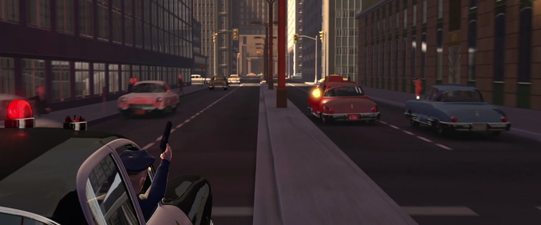 Камера резко отдаляется и мы попадаем прямо в машину плохих парней за которыми гонятся копы.