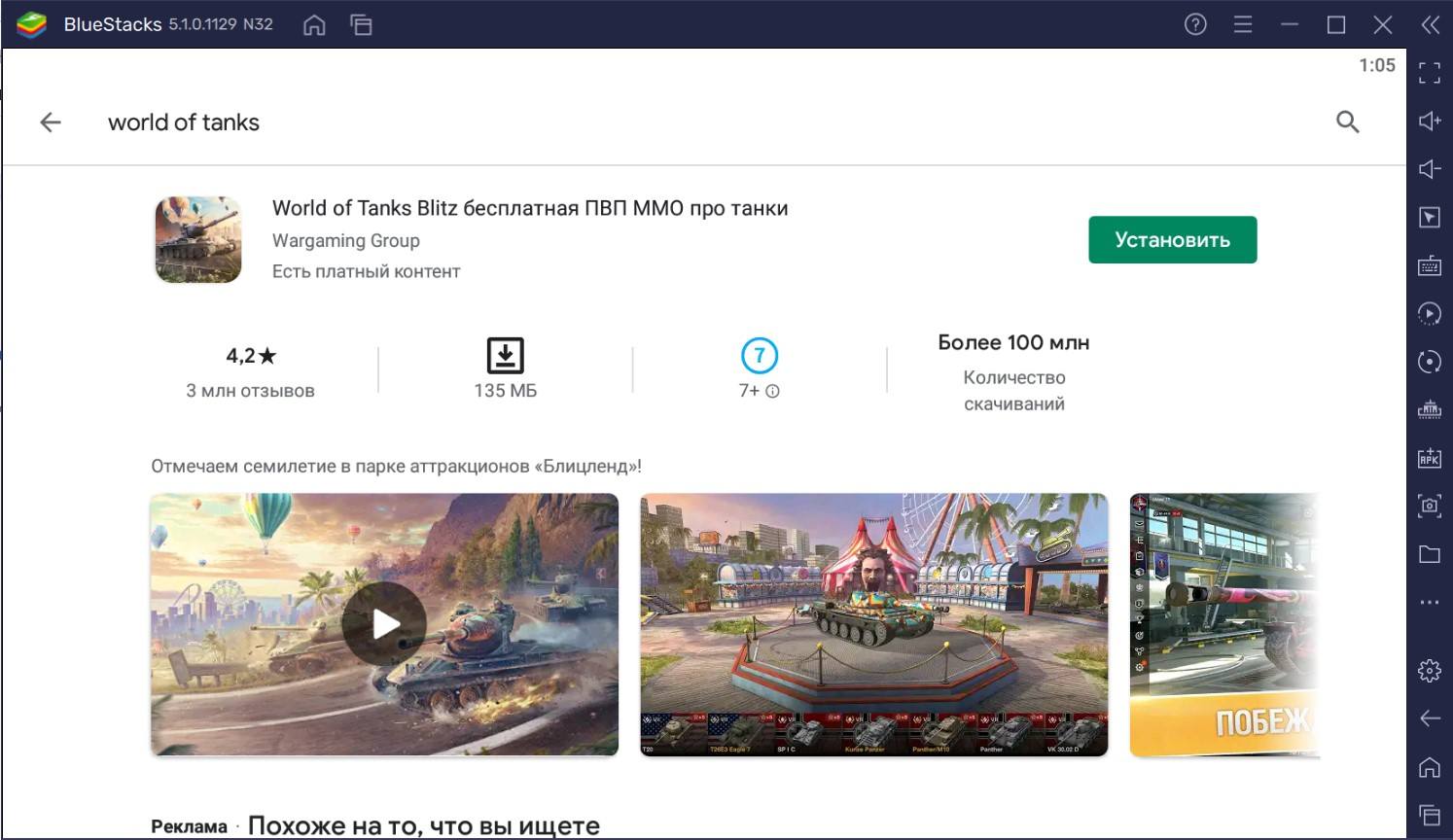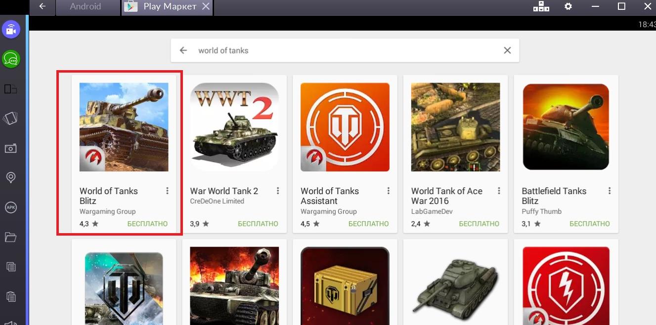 После авторизации находим приложении World of Tanks Blitz и устанавливаем его, делается это через уже имеющийся Play Маркет на BlueStacks.