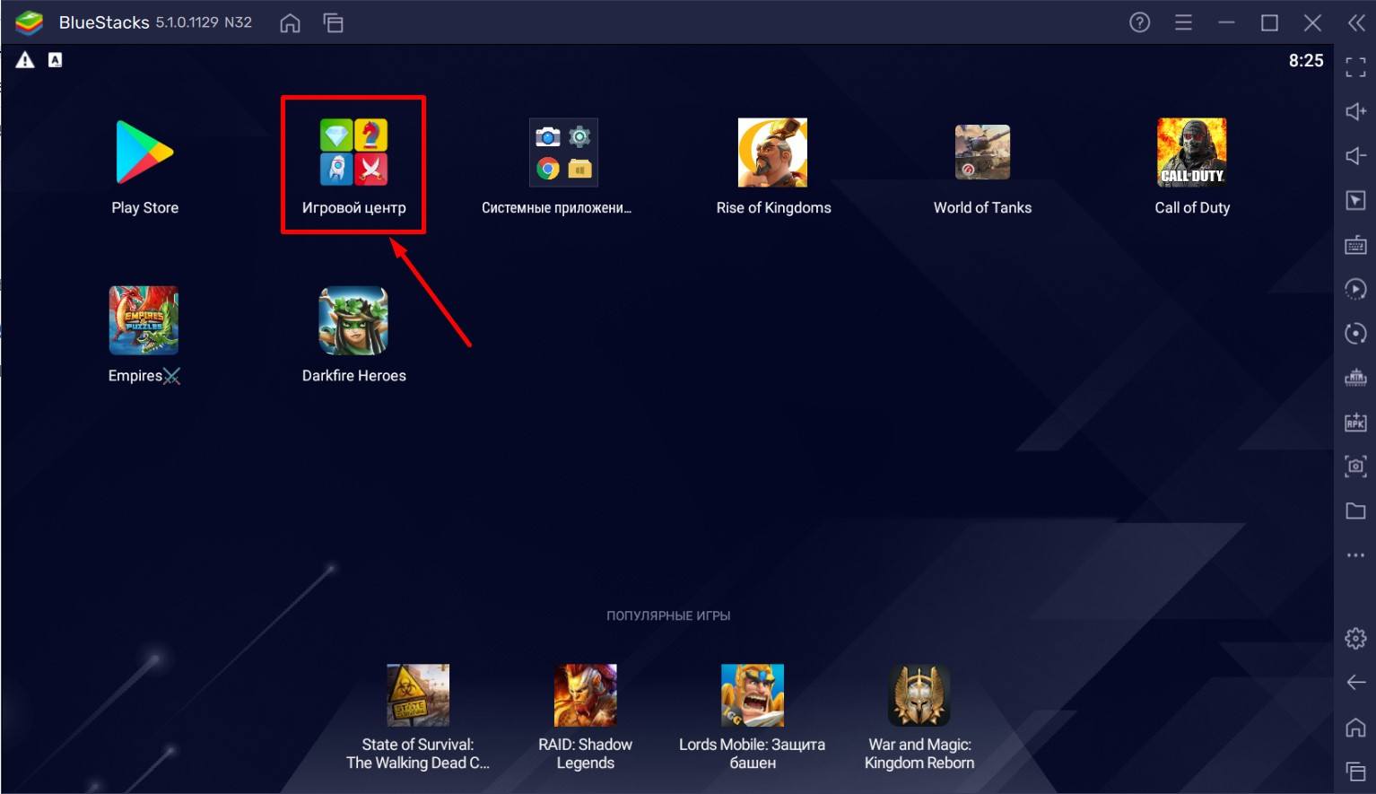 Вы также можете воспользоваться каталогом “Игрового центра” BlueStacks. Чтобы в него перейти, достаточно нажать кнопку, выделенную на изображении ниже. В нем вы найдете сотни самых интересных проектов, в числе которых будет и World of Tanks Blitz.