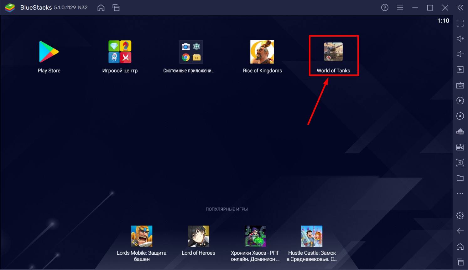 - По завершении скачивания закройте окно Google Play, перейдя на главный экран BlueStacks 5. Найдите иконку World of Tanks Blitz и нажмите на нее, чтобы запустить игру.