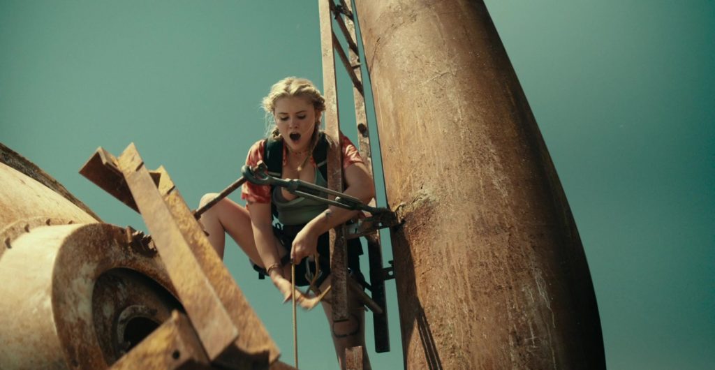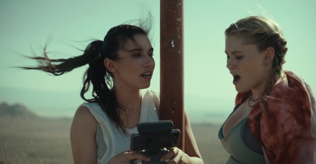 Ближе к концу фильма “Вышка” Хантер решает достать рюкзак, в котором осталась вода. Она срывается, но Бекки вытягивает подругу. Вскоре им приходит в голову отправить квадрокоптер с запиской о помощи. Однако и этот вариант отпадает: обнаружив, что его батарея почти полностью разряжена, девушки возвращают его назад.