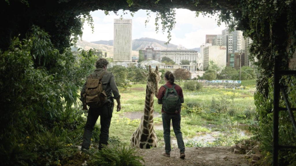 И тут наши герои встречают его – жирафа. Настоящего живого (даже не компьютерного) жирафа, который, кажется, и не в курсе, что случился апокалипсис. Сцена удивительно копирует игровую