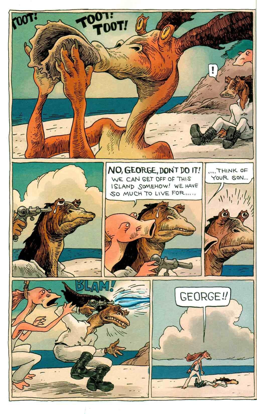 В момент, когда Джордж приставил бластер к виску, его жена прокричала: «Подумай о своем сыне!» Увы, это только укрепило желание Джорджа закончить дело. Он выстрелил себе в голову, но промазал. Видимо, неуклюжесть – это семейное для Бинксов. В конце комикса отец семейства пришел в себя и увидел Джа-Джа, который пытался отцепить от лица напавшего на него осьминога.