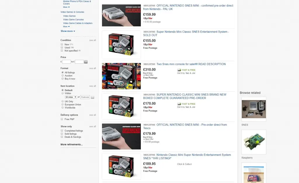 Как и следовало ожидать, скальперы продавали SNES Classic по грабительской цене (до 300 фунтов стерлингов). Это привело к тому, что Amazon UK ограничила заказы более чем на один SNES Classic. Тем не менее, eBay собирает все объявления о консоли, и представитель eBay сообщил Eurogamer: «Мы удалим объявления о предварительных выпусках предметов и аксессуаров, если до даты выпуска товара осталось более 30 дней».