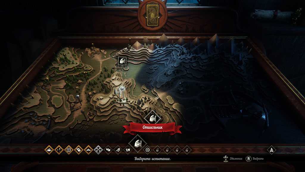 В отличие от первой части, Hand of Fate 2 не такая линейная по части прохождения и прогрессии. После первых двух вступительных испытаний, игроку дают возможность выбирать, какое он будет проходить следующим. Теперь, к слову, у нас не простой список с испытаниями, а отлично нарисованная карта местности, где видно, как далеко мы забрались. Для того чтобы открыть новые испытания, нужно заработать специальные токены (или жетоны – кому как нравится), которые дают за успешное завершение испытаний. Токены в Hand of Fate 2 выдаются не только за испытания – вы также зарабатываете их играя карты, используя предметы и т.д. Именно благодаря токенам игроку открывается новый контент. Добыв токен, вы можете получить до 5-10 новых карт – в зависимости от сложности испытания.