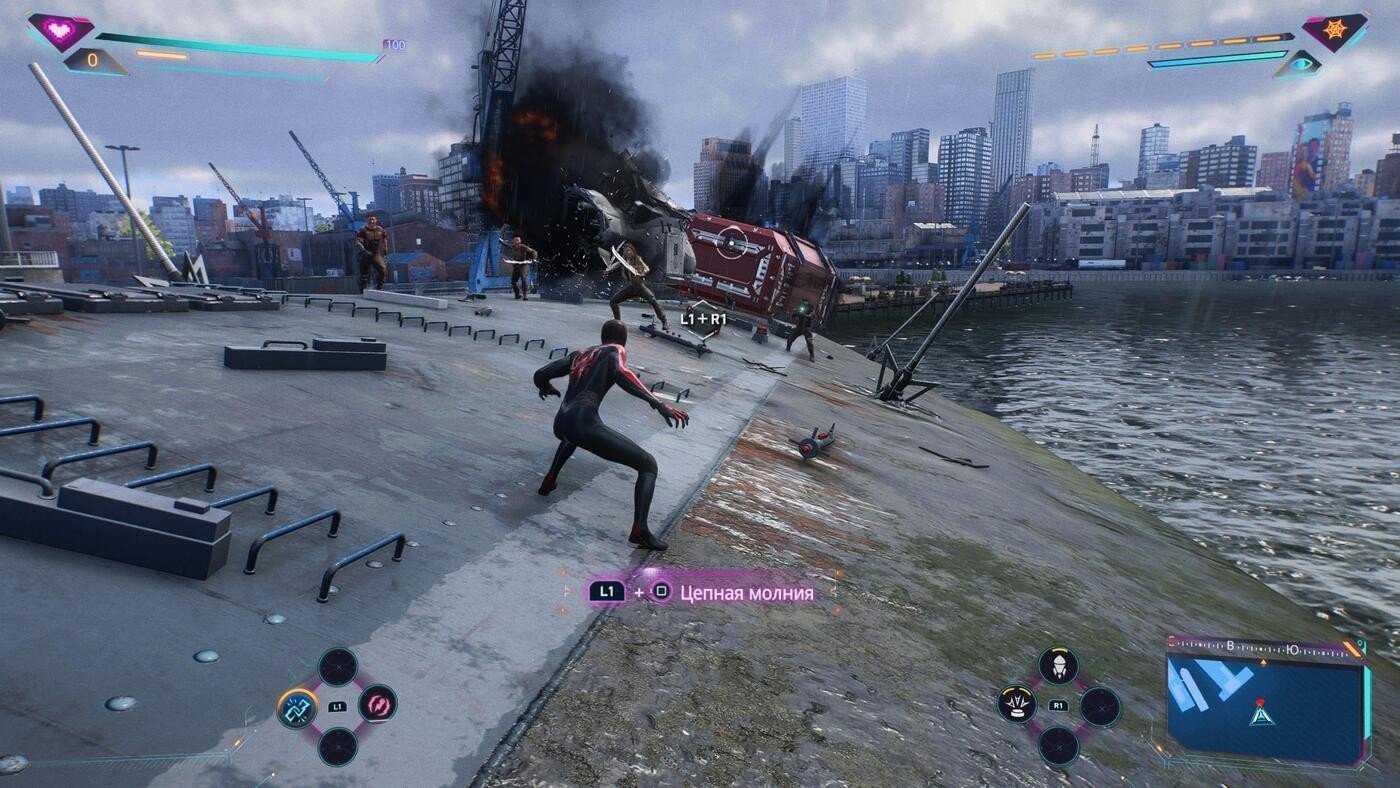 Еще большей похвалы заслуживают сюжетные миссии. Insomniac сделала много уникальных геймплейных эпизодов. В одном из них Питер Паркер катается на велике, и вы прямо как в GTA крутите педали и едете к нужной точке. А буквально через несколько минут после этого момента Майлз окажется внутри тонущего корабля и применит все свои электрические силы, чтобы спасти экипаж.