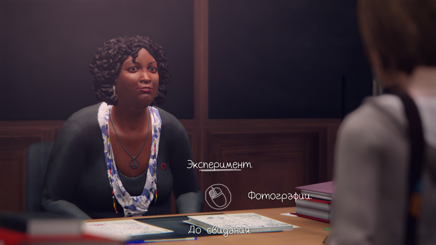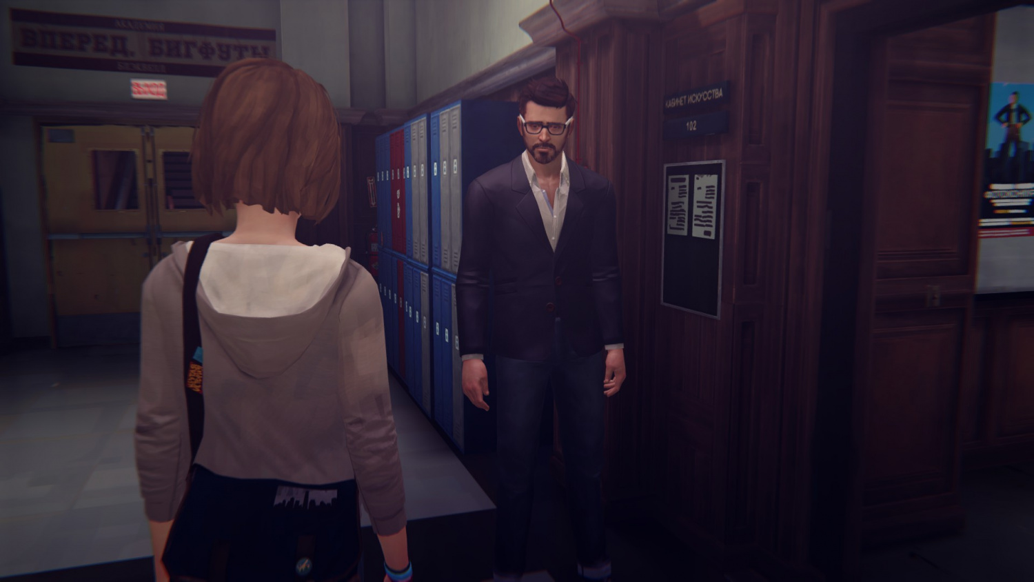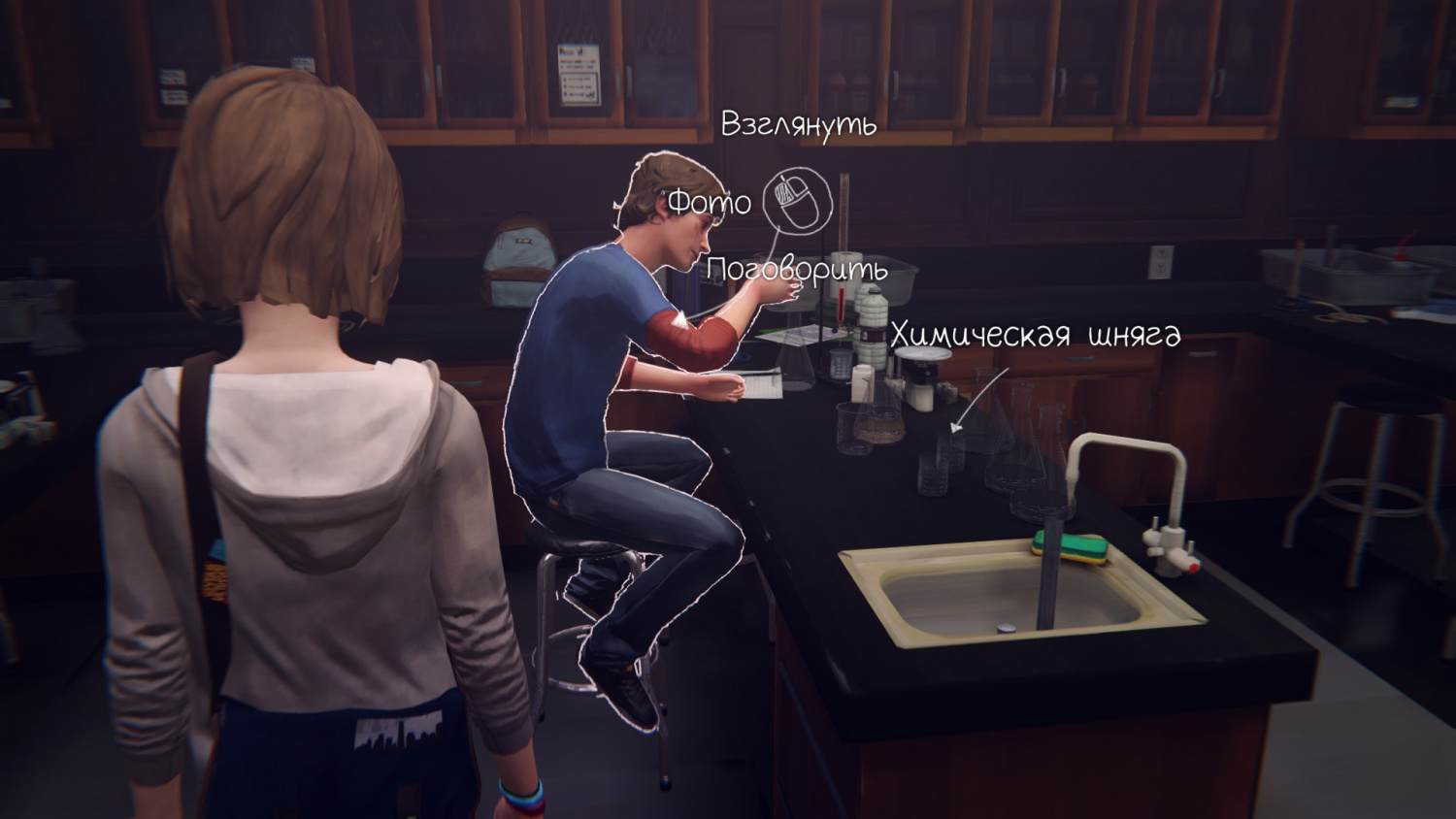 Там же мы найдем и Мисс Грант, если заговорим с ней, то она еще раз поблагодарит за подписанную петицию против камер наблюдений. В классе найдем Уоррена – подходим, он спросит у нас про реагент, который лучше добавить в эксперимент.