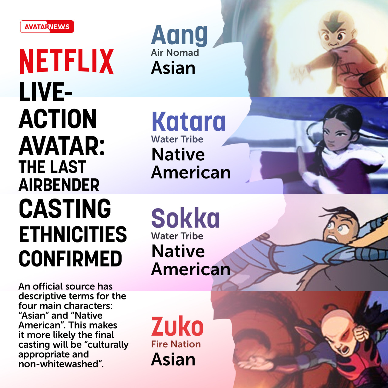 Новый Аватар проекты также могли бы быть более внимательными к кастингу цветных актеров озвучивания. «Четыре нации» вдохновлены культурами Азии и коренных народов, но голоса в обеих сериях преимущественно белые