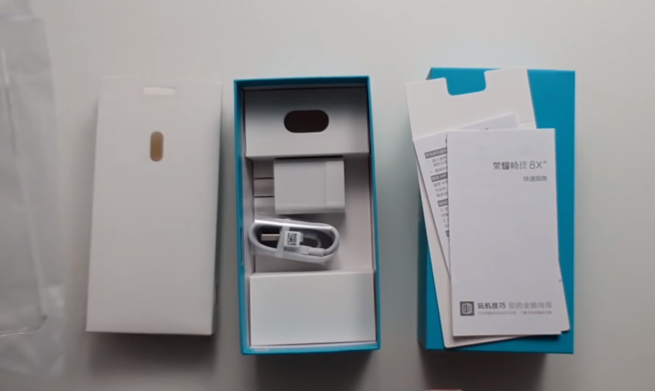 В маленькой и вместительной коробочке упакован блок питания, шнур микро- USB, и сам металлический Huawei Honor 8X. Для упаковки был выбран приятный голубой цвет с названием модели гаджета.