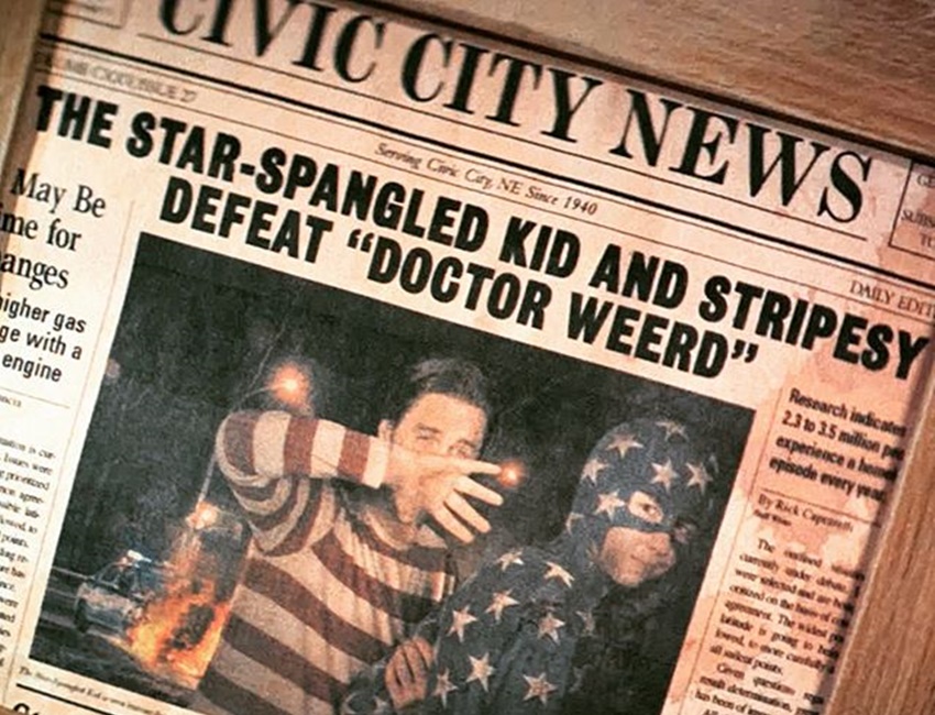 Кадр из сериала. В заголовке газеты упоминается злодей по имени Доктор Вирд. Газета называется «Гражданские новости города». В комиксах Civic City – это оригинальная штаб-квартира Американского общества юстиции, и, следовательно, дань ранним комиксам 1940-х годов